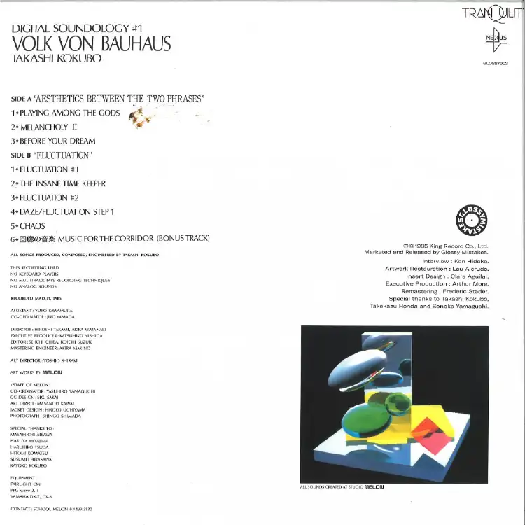 Continuing in this endless path, Glossy Mistakes adds Takashi Kokubo’s brilliant “Volk Von Bauhaus” to its catalogue, with the Japanese masterpiece as the third official release of the Spanish label. As most of 80’s Japanese ambient and environmental music, “Volk Von Bauhaus” is an audio impression designed to give a multi-sensory experience to the listener. An effort to make things audible, an exercise of understanding and soundtracking objects or situations. The main objective of this sound is to create an iconic musical landscape to accompany a specific place.